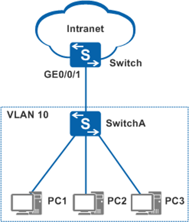 如图,树状组网中,多个用户通过SwitchA和汇聚层设备Switch进行通信。为了保证汇聚设备的安全性,控制接入用户的数量,可以在汇聚设备配置端口安全功能,同时指定安全MAC地址的限制数。