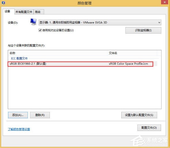 4、点下面的“添加”按钮,添加另一个配置文件。选择sRGB IEC61966-2.1,解决问题。