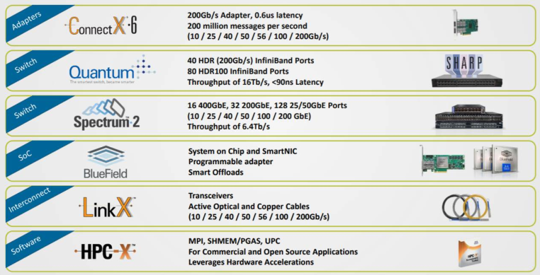 为了让网络来协助处理数据,Mellanox不断去开发智能网络,在2019年11月份,Mellanox发布了全球首个 200Gb/s 数据中心网络互连解决方案。Mellanox ConnectX-6 适配器、Quantum交换机、 LinkX线缆和收发器一同构成了面向新一代高性能计算、机器学习、大数据、云、web 2.0和存储平台的完整 200Gb/s HDR InfiniBand 网络互连基础设施。