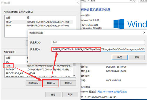 c、接下来在win10系统变量了找到Path这个变量,Path变量不用新建,系统原本就有,我们只需要找到它点“编辑”,如下图所示: