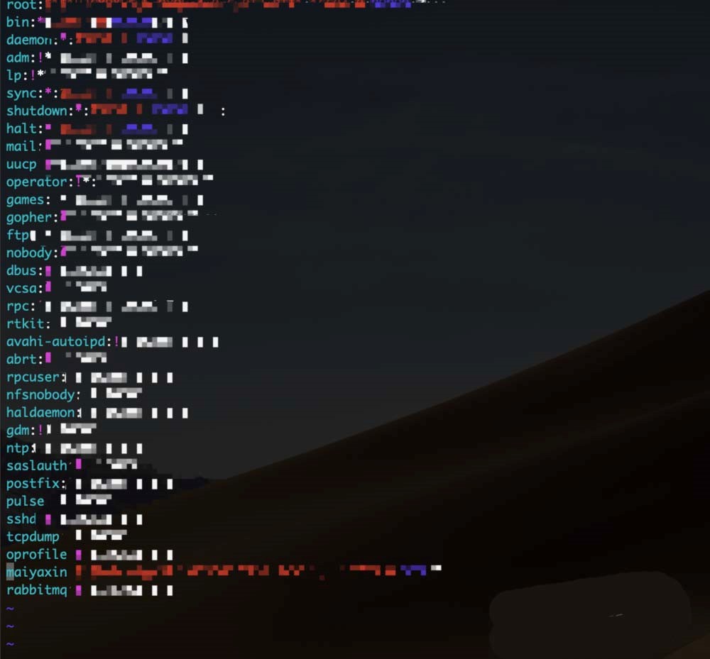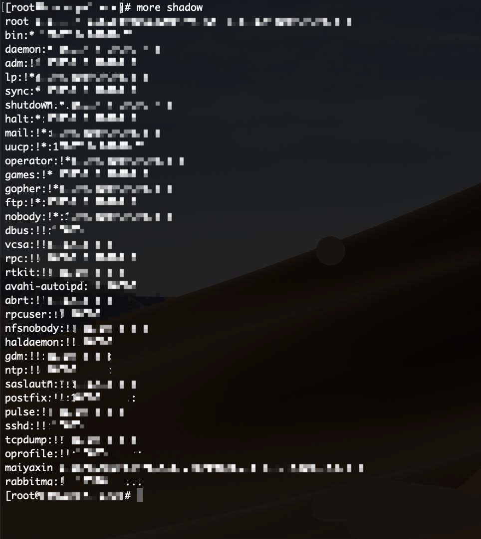 注:因为shadow这个文件的权限是 000,所以保存的实际加密密码除 root 用户外,其他用户是不能查看的,这样做有效地保证了密码的安全。如果这个文件的权限发生了改变,则需要注意是否是恶意攻击。