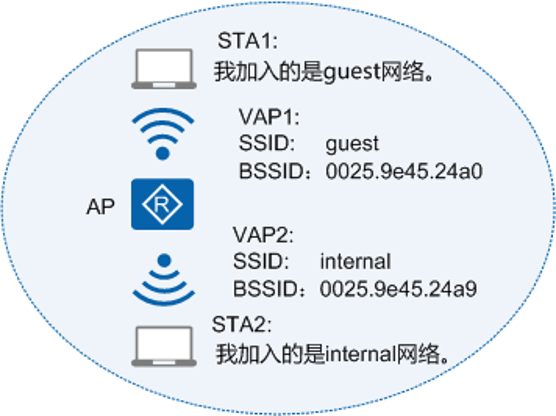 · 虚拟接入点VAP(Virtual Access Point):是AP设备上虚拟出来的业务功能实体。用户可以在一个AP上创建不同的VAP来为不同的用户群体提供无线接入服务。