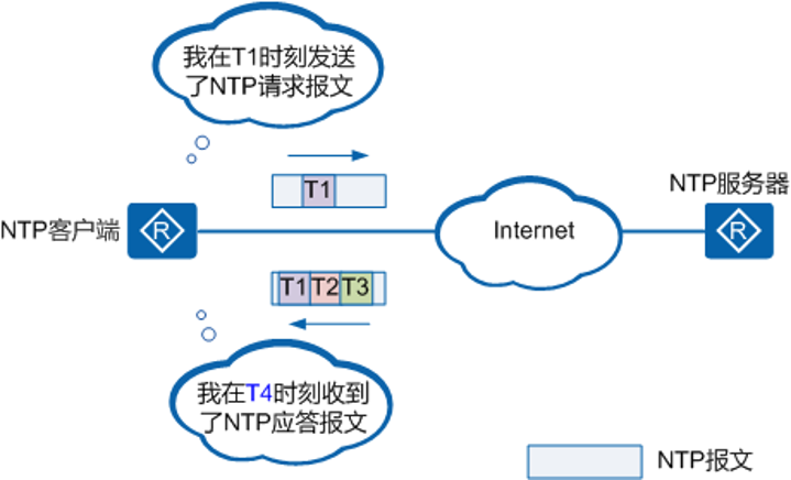 1. NTP客户端在T1时刻发送一个NTP请求报文给NTP服务器,该请求报文携带离开NTP客户端时的时间戳T1。