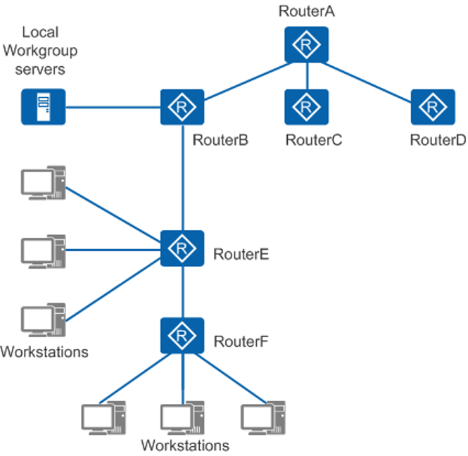在如图4所示的组网中,为达到全网的时钟同步,将接入标准时钟的RouterA作为网络中的NTP主时钟服务器。RouterA分别和RouterB、RouterC、RouterD配置为单播客户端/服务器模式,RouterA作为服务器。RouterE分别和上行的RouterB以及下行的RouterF采用对等体模式。