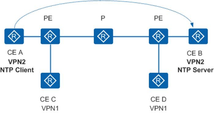 NTP服务在VPN网络的应用如图4-9所示。CE A和CE B同属于VPN2。CE B作为NTP单播服务器,CE A作为NTP单播客户端,两者可实现NTP时间同步。