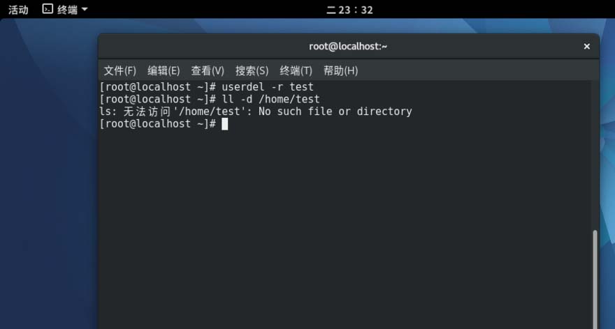 #userdel -r test (参数-r表示连同home目录一起删除)