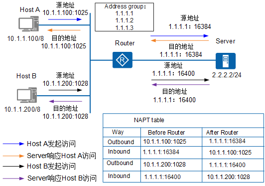 静态NAT/NAPT还支持将指定私网范围内的主机IP转换为指定的公网范围内的主机IP。当内部主机访问外部网络时,如果该主机地址在指定的内部主机地址范围内,会被转换为对应的公网地址;同样,当公网主机对内部主机进行访问时,如果该公网主机IP经过NAT转换后对应的私网IP地址在指定的内部主机地址范围内,也是可以直接访问到内部主机。