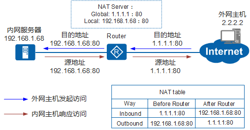 NAT Server可以很好地解决这个问题,当外网用户访问内网服务器时,它通过事先配置好的“公网IP地址+端口号”与“私网IP地址+端口号”间的映射关系,将服务器的“公网IP地址+端口号”根据映射关系替换成对应的“私网IP地址+端口号”。