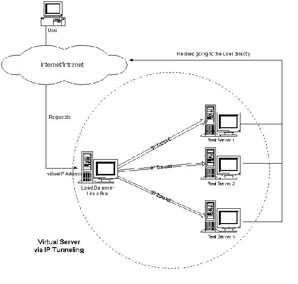 上图来自Linux Virtual Server Project,为他们使用IP隧道实现的这种负载分担能力的请求/回应过程,此时每个后台服务器都需要进行特别的地址转换,以欺骗浏览器客户,认为它的回应为正确的回应。
