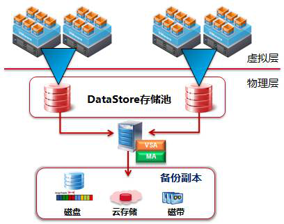 在生产存储不支持硬件快照的情况下,物理MA(采用物理机)和VSA能通过SAN访问到Data Store所在的LUN,通过VSA获取备份VMs列表和变化数据(基于CBT技术的虚拟机软件快照),通过SAN网络进行备份。