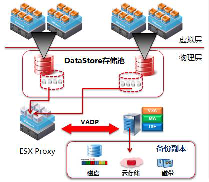 在生产存储支持IntelliSnap(硬件快照)的情况下,ESXi Proxy和物理MA和能访问到Data Store所在的LUN,ESX Proxy通知虚拟机完成存储硬件快照,快照以临时Datastore的方式挂载到VSA(装载快照),MA通过SAN网络提取备份列表和备份数据,直接从存储读取数据备份。备份数据不通过生产ESXi,属于Server Free备份组网。