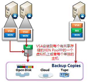 对Simpana备份软件来说,备份代理VSA需要安装到带有Xen Pool存储的Xen虚拟机中,MA介质服务器需要部署在单独的物理机或将MA安装在虚拟机中。备份代理VSA通过Citrix Xen API交互获取备份虚拟机列表信息,并通过MA备份数据到介质。