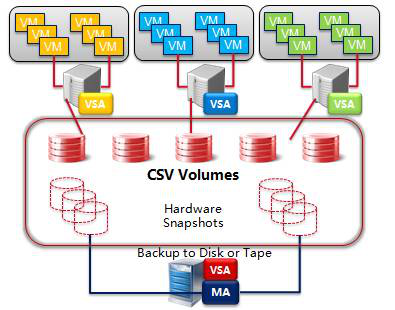 VSS卷影服务是微软推出的数据保护架构,可以和备份软件配合完成快照和数据一致性保护。Simpana提供了针对Hyper-V多个节点上的虚拟机集群统一管理,可以更加精确的根据业务需求创建虚机保护策略。