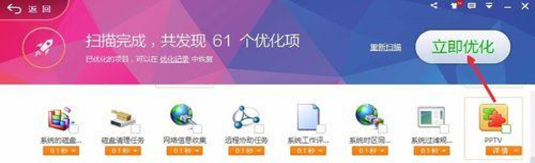 3、这时候我们这里点击开始扫描,对系统进行优化。结束后点击立即优化。