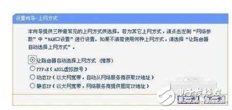 随后会出现对上网方式的选择,一般分为五种方式,这里由于是在“设置向导”中,因此只出现了三个主要的上网方式,分为PPPoE(ADSL虚拟拨号)、动态IP(以太网宽带,自动从网络服务商获取IP地址)、 静态IP(以太网宽带,网络服务商提供固定IP地址),其余两种我们会在后面介绍到。