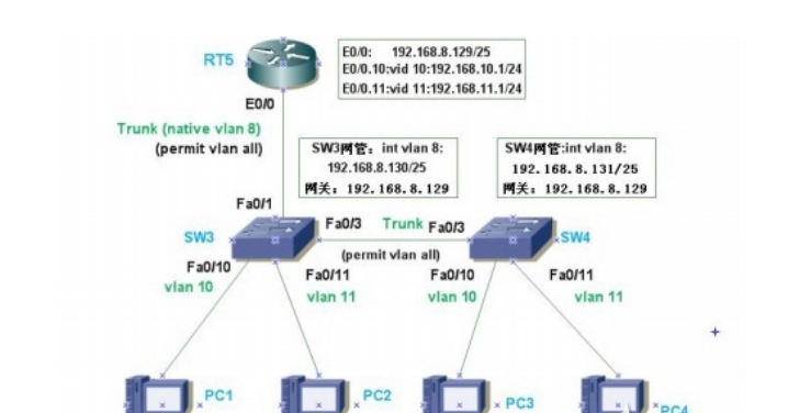 实现小型企业局域网二层广播域VLAN隔离和三层全网全连通;掌握Vlan、Trunk、单臂路由的配置方法;分析小型企业局域网广播域大小及二层网络通信过程;分析PC1pingPC4的三层通信过程和二层通信过程;分析PC4pingSW4网管地址的三层通信过程和二层通信过程。拓扑图如下: