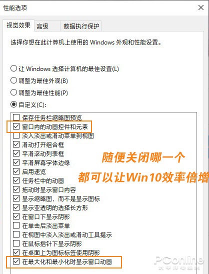 Win10的UI特效特别消耗资源,于是便有网友想到了Win7时代的方法,将不必要的特效直接关闭。But……事实并非如此简单,Win10的特效可谓是打碎了骨头连着筋。就拿“窗口内的动画控件和元素”和“在最大化和最小化时显示窗口动画”来说,随便关闭哪个,都能大幅提高界面效率。但实际,总会有一些东西让你无法两全其美。