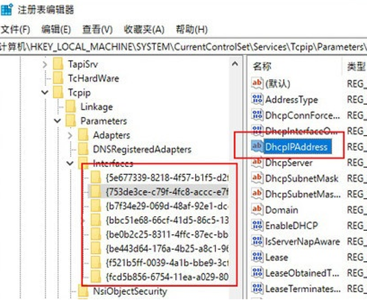 3. 依次点击下方注册表项,检查右窗格中是否包含“DhcpIPAddress”值;