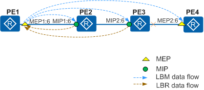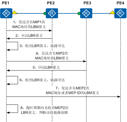 如果MEP1到MEP2之间的路径有故障,则故障点下游的MEP或MIP将无法收到LTM,也不会回复LTR,可据此判定故障点的位置。例如当MEP1到MIP2之间的路径正常,而MIP2和MEP2之间的路径有故障时,MEP1可以收到MIP1、MIP2回复的LTR,但收不到MEP2回复的LTR,于是可判定MIP2和MEP2之间的链路或设备有故障。