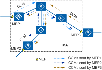 CCM由MEP产生并发送。如图2所示,MEP1、MEP2和MEP3是同一个MA的3个MEP。当使能了CCM发送功能后,MEP1定期以组播方式向MEP2和MEP3发送CCM。同样,MEP2以相同的周期向MEP1和MEP3发送CCM,MEP3也以相同的周期向MEP1和MEP2发送CCM。