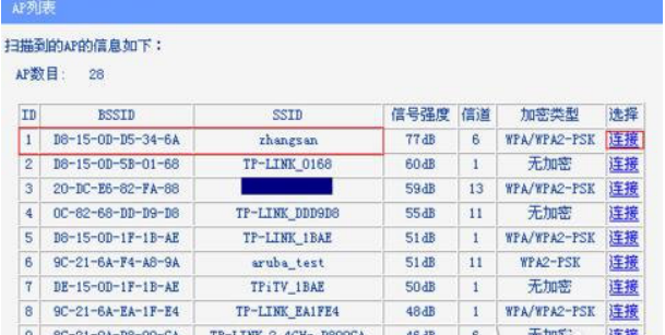 在扫描页面中找到主路由器的SSID,点击 连接。