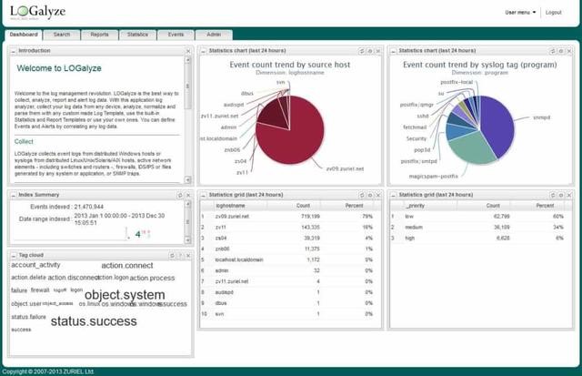 LOGalyze是一款面向企业用户的开源日志分析器和网络监控工具。该产品支持具有实时事件检测功能的设备,Windows主机和Linux / Unix服务器。收集日志数据后,可以使用程序的搜索功能查找所需的信息。