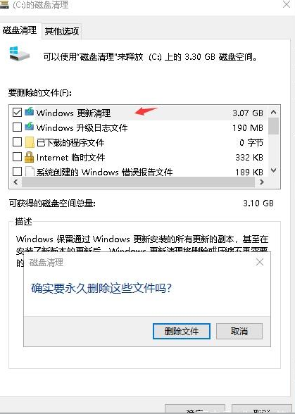 2.勾选需要清理的文件,选择后点选“删除”。如果选择了清理“系统文件”,则会显示windows更新后残留的文件,也可以进行清理。