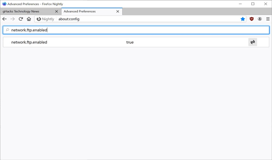 2. 搜索 network.ftp.enabled:将首选项设置为 TRUE 以在 Firefox 中启用 FTP 支持;将首选项设置为 FALSE 可禁用 Firefox 中的 FTP 支持。