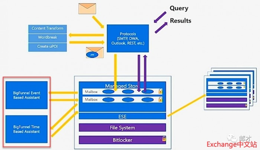 2019的邮件存储引擎还是与前作相同,熟悉2013或2016的朋友肯定知道Node Runner进程,也许会疑惑既然2019重写了存储引擎的代码,为什么Node Runner还在图上。其实BigFunnel只针对索引存储,赋予了原索引引擎更多的功能,例如语言识别,过滤,短语智能分割,这些功能很大程度上依赖于磁盘I/O,所以支持全闪存技术的Exchange 2019才会考虑将其发布出来。