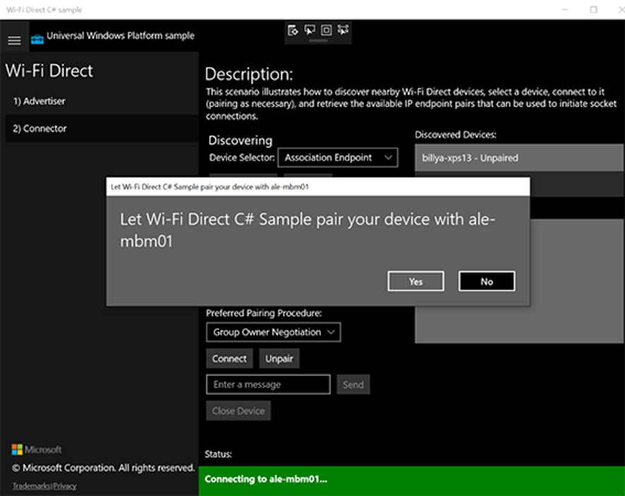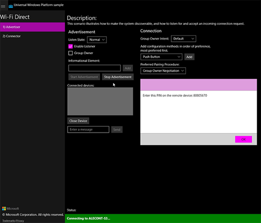 4.你应看到在 Windows 10 电脑上运行的 WiFi Direct 示例