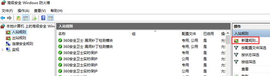 3.请继续点击【高级设置】,在【高级设置】界面,选中左侧的【入站规则】选项,然后点击右侧的【新建规则】。