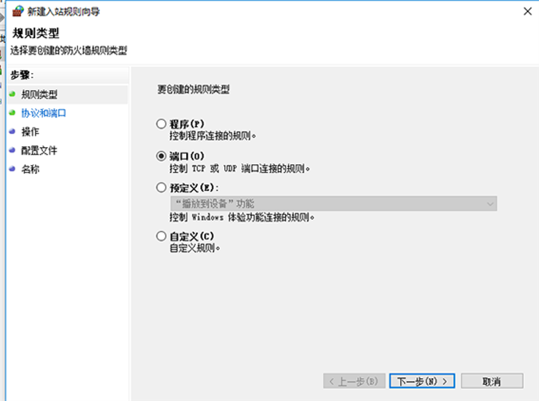 4.在【规则类型】的选项之中,请选中【端口】选项,然后点击【下一步】。
