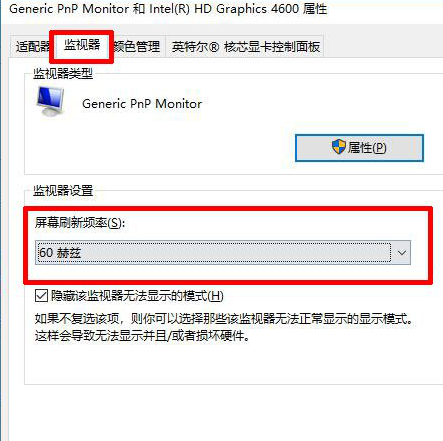 4、在弹出的显示适配器属性窗口中,我们点击切换至“监控器”选项,我们在监控器设置就可以看到屏幕刷新频率的下拉框设置了,如果显示器是144Hz,我们就选择“144赫兹”,如下图所示。