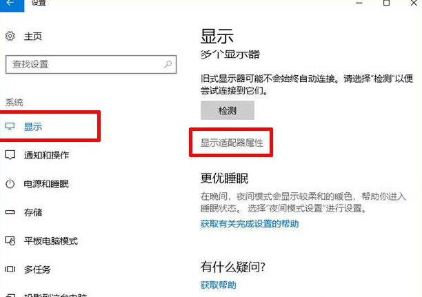 3、在系统设置的界面中,在显示的选项卡中,我们将右侧栏窗口中的滚轮下拉,点击选择“显示适配器属性”,如下图所示。