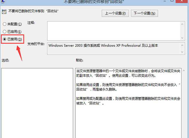 3、在"不要将删除的文件移到回收站"的界面中,如果想要删除文件后进入回收站,就选择"已禁用",如果想要彻底删除文件而不进入回收站,那么就选择"已启用",设置完毕之后将电脑重新启动即可。