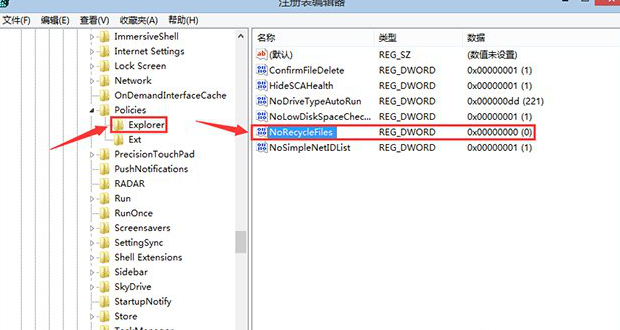 2、在注册表编辑器界面中,我们依次展开“HKEY_CURRENT_USER\Software\Microsoft\Windows\CurrentVersion\Policies\Explorer”,单击选中"Explorer",在窗口右边找到"NoRecycleFiles",如下图所示。