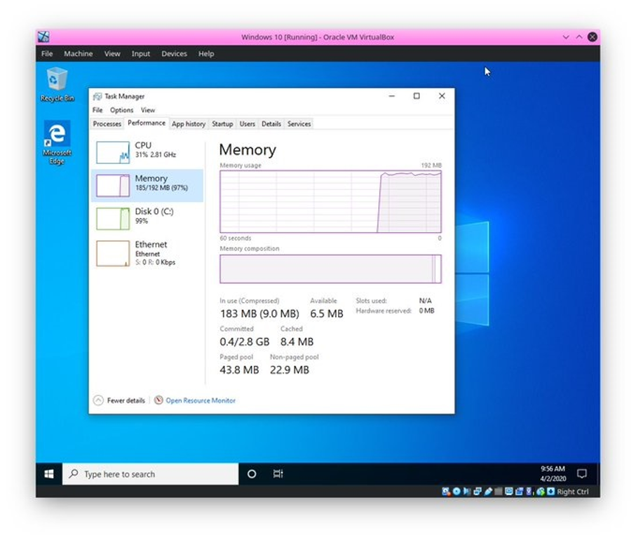 最近有网友设法使Windows 10在仅192MB的RAM内存上运行。最近使用Windows 10系统,并远远低于微软所需的1GB内存建议。这一壮举是在Dell Inspiron 3670上Arch Linux运行Oracle VM Virtualbox实现的。