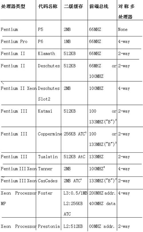 注: Intel现在生产的CPU中,Pentium 4(奔腾4)和Celeron(赛扬)是面向PC的,Xeon(至强)、XeonMP和Itanium(安腾)是面向工作站和服务器的。其中Itanium是与其他CPU完全不同的64位CPU,设计时并没有考虑用于现有的Windows应用。其他的处理器虽然在最高工作频率、FSB(前端总线频率)和缓存容量等方面各有不同,但内部设计基本相同,同时可保证软件兼容。Pentium 4(Celeron)和Xeon(至强)的最大差别是Xeon能构建多处理器系统,而P4不行。P4组建的系统中只能用一个CPU,Xeon可以用2块CPU组建双处理器系统,而Xeon MP可以用4块以上CPU组建系统。“MP”也就是“Multi Processing Platform”(多处理器平台)。